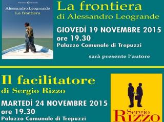 Data: dal 19/11/2015 al 24/11/2015 - Categoria: Appuntamenti delle Associazioni Lecce e provinciaGiovedì 19 novembre e martedì 24 novembre il Palazzo comunale di Trepuzzi ospiterà rispettivamente Alessandro Leogrande, autore de La Frontiera e Sergio Rizzo autore de Il Facilitatore