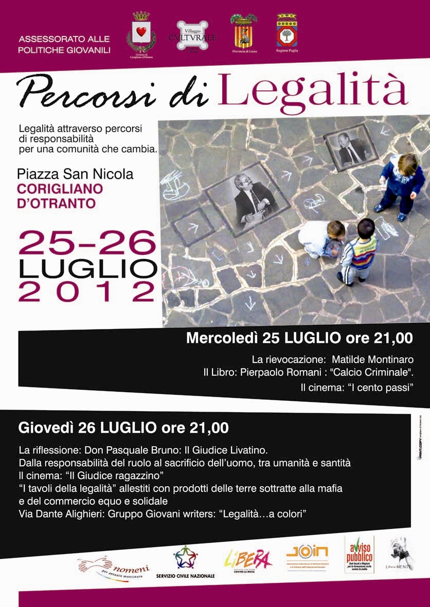Il tutto realizzato nell“Agorà, Piazza San Nicola che costituirà spontanea, naturale scenografia per una cinema-teatro fatto di storia e cultura locale. Il pubblico che interverrà occuperà i "tavoli della legalità" , tavoli allestiti non con tovaglie sponsorizzate ma che riportano citazioni , affermazioni e didascalie sulla lotta alla criminalità mafiosa su ricerca realizzata dai giovani impegnati nei progetti del "Servizio Civile" del Comune di Corigliano d“Otranto. Saranno poi dispensati prodotti provenienti dalle cooperative che utilizzano le terre sottratte alla mafie e del commercio equo e solidale, in virtuosa coerenza con gli argomenti trattati.