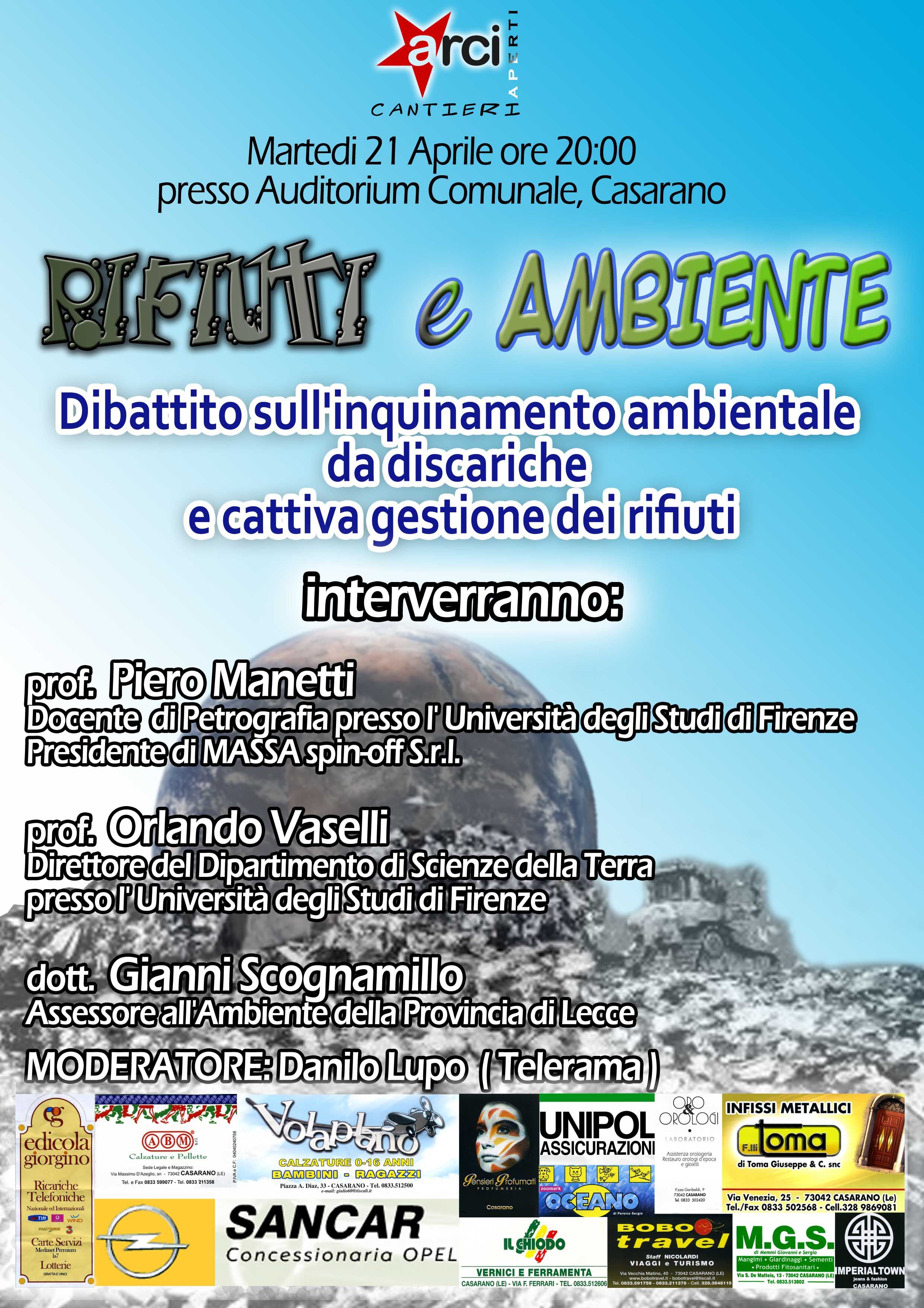 martedì 21 aprile, alle ore 20, presso l“auditorium comunale di Casarano, nel dibattito "Rifiuti e ambiente" organizzato dall“