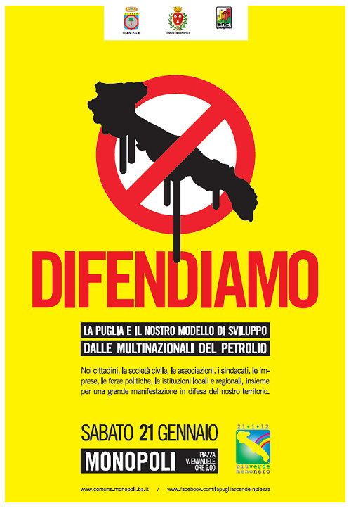 una grande manifestazione a Monopoli (Bari) sabato 21 gennaio dallo slogan più che eloquente: "Più verde, meno nero". Un no corale quello pugliese, convinto, partecipato e preoccupato per la possibilità che, nonostante i pareri Via della Regione Puglia richiesti dalle grandi compagnie petrolifere alla ricerca dell'oro nero siano stati tutti negativi, le autorizzazioni per ispezioni sismiche nel Basso Adriatico prodotte dal ministero dell'Ambiente dello scorso Governo possano scavalcare la volontà popolare.